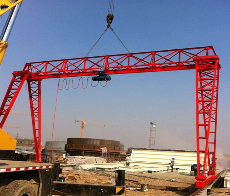 電動葫蘆門式起重機是有軌運行的中小型起重設備,主要由門架(主梁、支腿、下橫梁等)、起升機構、運行機構及電控部分組成,以電動葫蘆作為起升機構,工作時沿主梁工字鋼下翼緣運行。門架結構分箱形和桁架兩種,箱形工藝好,制作方便;桁架自重輕,抗風能力強。整機具有自重輕、結構簡單、安裝維修方便等特點,適用于中小起重量范圍內的廠礦、貨場及倉庫等室外場所作一般裝卸吊運工作。
